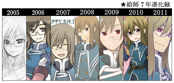 2005年8月頃大佐発表時に一目惚れで描いて2006年がオールデジタル描き始めたあたりで2008年のがPC変わって色が迷子で2009年は割りと絵柄が落ち着いてるような2010年はなんか色が明るすぎて今はもう見れません。進化、とは違う気がしますが納得の行く大佐が描けるまで頑張りたいです。